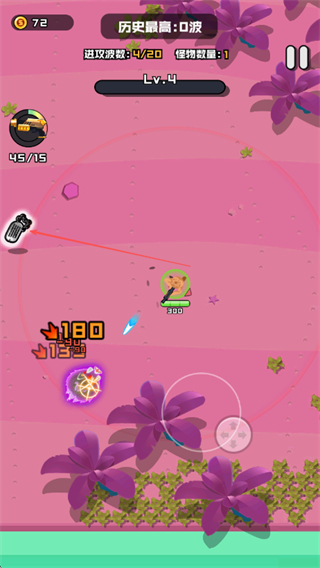 1、操控角色移动通过下方虚拟摇杆,射击消灭Lv.3、Lv.4等不同等级的怪物,积累金币和经验,提升进攻波数。