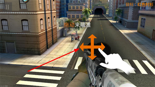 2、拖曳屏幕调整狙击枪瞄准方向,寻找目标所在位置,瞄准过程中需保持耐心,区分目标与平民,避免误杀。