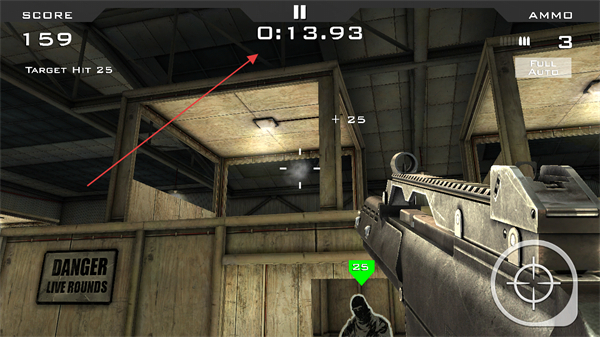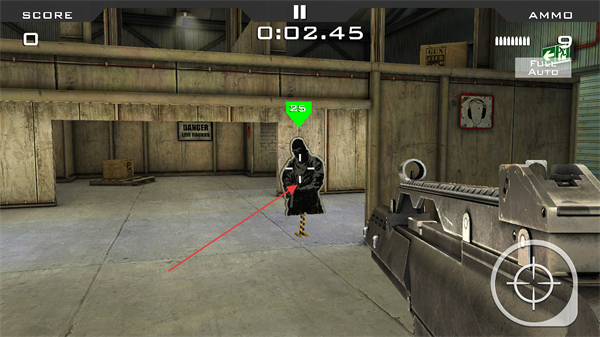1、瞄准带有绿色25标识的目标射击,积累分数,注意剩余弹药和时间。