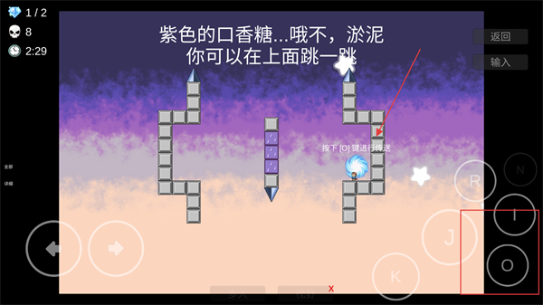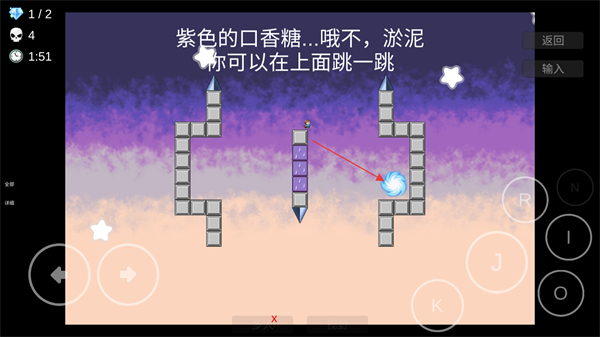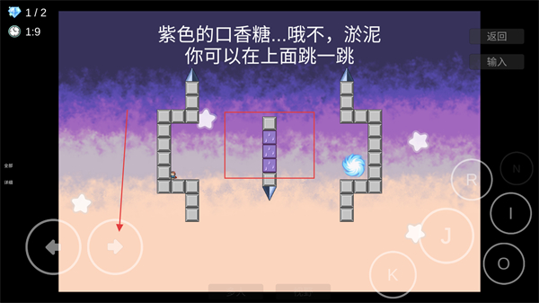 2、进入关卡后,控制角色向右移动,跳至紫色淤泥方块上。