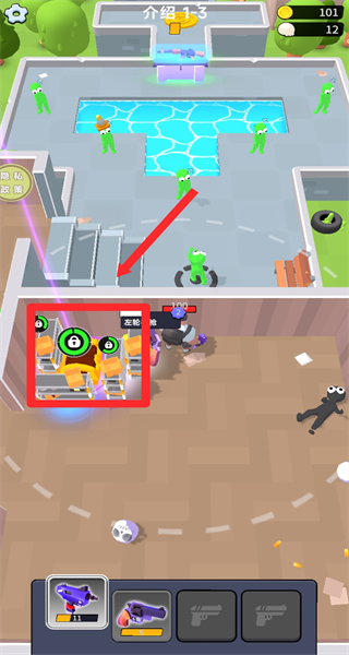 3、遇到集群的绿色丧尸时,切换底部更强力的武器如紫色武器,提升攻击效率,快速击败多个丧尸目标。