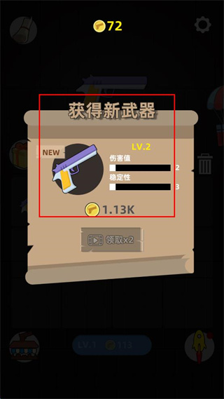 2、游戏过程中可获得新武器,界面会弹出提示框,显示武器等级伤害值稳定性及价格,可选择领取。
