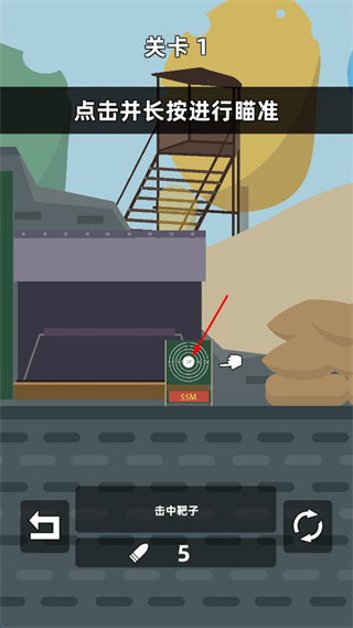 3、进入关卡1,按提示点击并长按进行瞄准,瞄准55米处靶子,点击发射子弹击中靶子。