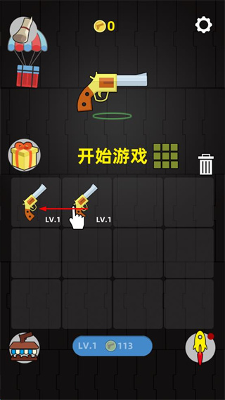 1、打开软件显示主界面,中间有开始游戏按钮,下方有武器合成提示,点击开始游戏进入关卡。
