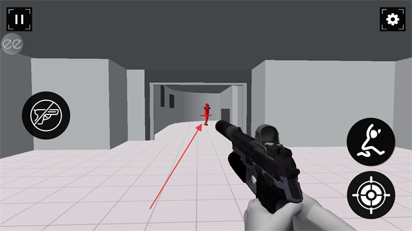 4、点击瞄准按钮,精准射击远处红色敌人,消灭目标推进游戏。