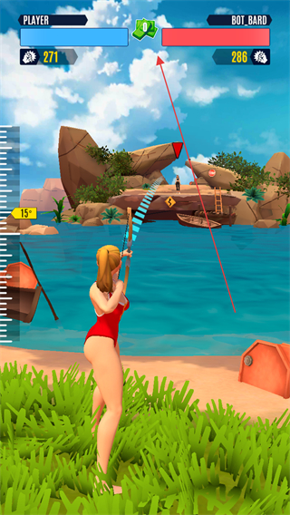 2、根据场景地形如水域、岩石区和距离,精准调整角度,确保箭的轨迹准确。