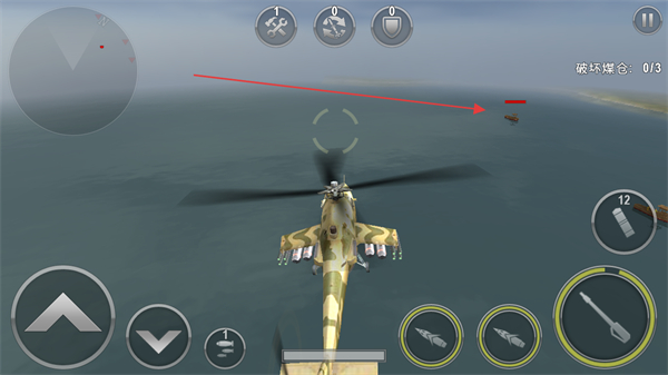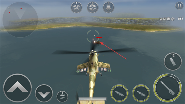 3、操控直升机移动,靠近敌方目标区域,瞄准红色标记的目标。