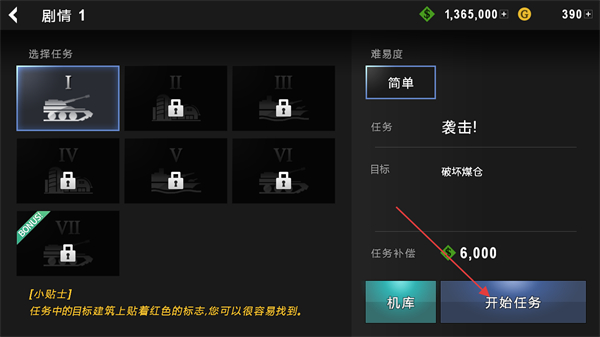 1、选择剧情1任务,点击开始任务进入袭击!任务,目标是破坏坏仓。