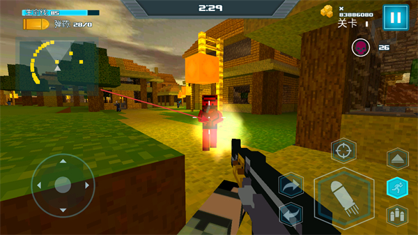 3、瞄准红色敌人,使用枪械射击,注意自身生命值和弹药量。