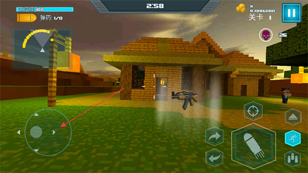1、使用左侧摇杆移动角色,在关卡1的像素场景中探索,寻找敌人。