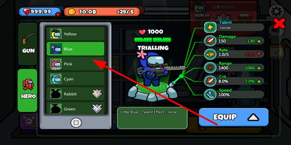 2、在角色界面选择不同的英雄选项,点击装备按钮完成切换,使用新角色的属性与技能参与对局。