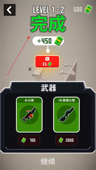 4、成功消灭所有敌方单位后,完成关卡,领取金币奖励,可选择解锁新武器,继续挑战下一关。