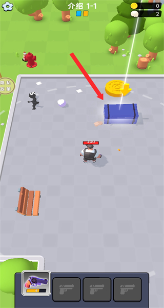 2、我们需跟随箭头指引移动到蓝色箱子附近,靠近后可获取道具或资源,为后续对抗丧尸积累物资。