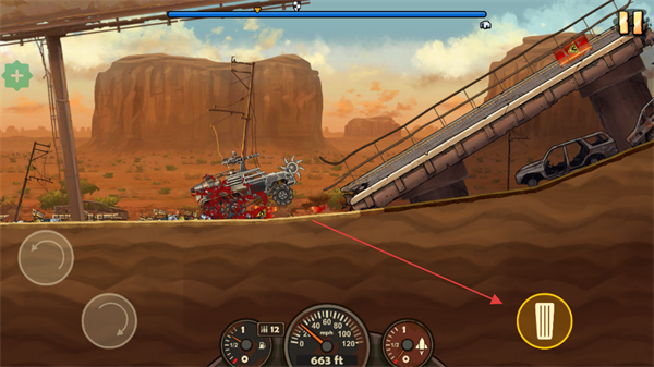 2、遇到僵尸时,点击垃圾桶图标,碾压僵尸获取资源,提升车辆性能。
