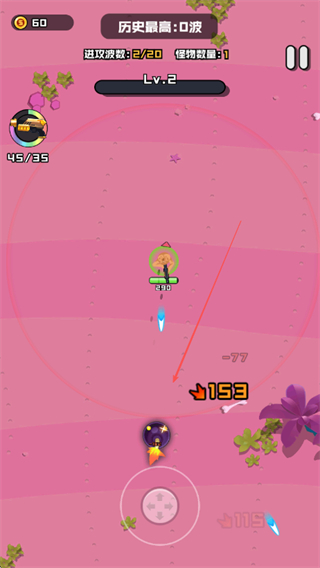 2、在战斗中躲避怪物攻击,同时尽可能多地消灭怪物,提升进攻波数如从1/20到2/20和等级。