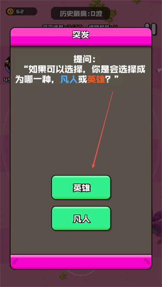 4、遇到突发提问如选择成为英雄或凡人,根据喜好选择,继续游戏挑战更高分数和关卡。