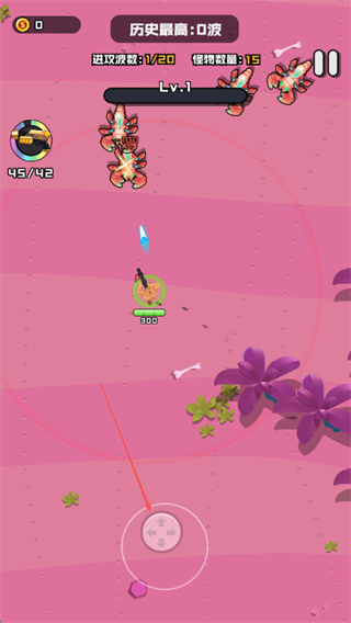 1、操控角色移动通过下方虚拟摇杆,射击消灭Lv.1、Lv.2等不同等级的怪物,积累金币和经验。