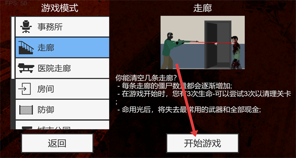 1、在像素射击世界游戏中,选择“走廊”游戏模式,点击开始游戏进入游戏准备界面。