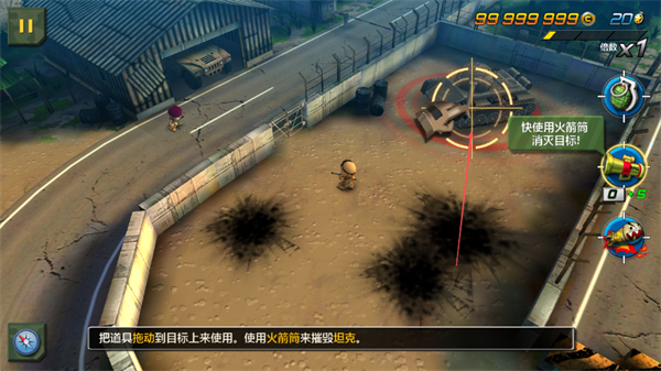3、拖动火箭筒道具到坦克目标上,使用火箭筒摧毁坦克,完成重型目标消灭任务。