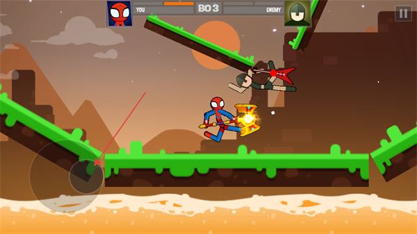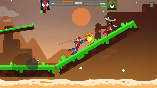 1、操控蜘蛛火柴人移动,利用武器攻击敌方,注意利用地形如倾斜平台调整站位。