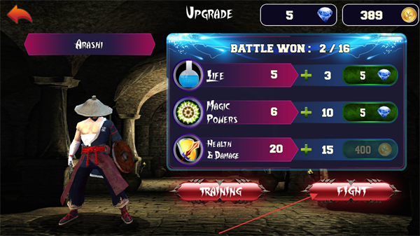 1、点击FIGHT按钮进入对战,可先升级角色的生命、魔法、伤害等属性,提升战力。