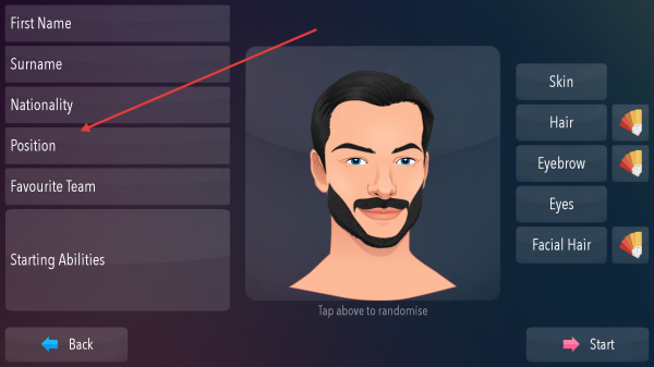 1、游戏初始,在角色创建界面,填写名字、姓氏等信息,点击Position选择角色在球队中的位置,还能通过右侧选项调整肤色、发型等外观。