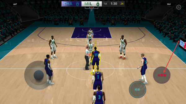 3、比赛开始,通过左下角的虚拟摇杆控制球员移动跑位,当出现球权争夺时,点击右下角的抢夺按钮尝试获得球权。