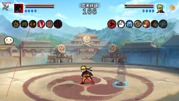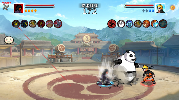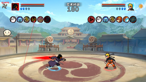 2、进入忍术对战场景,利用方向键和技能键操控角色走位与释放技能,观察屏幕上方的血量条和分数,了解对战局势。