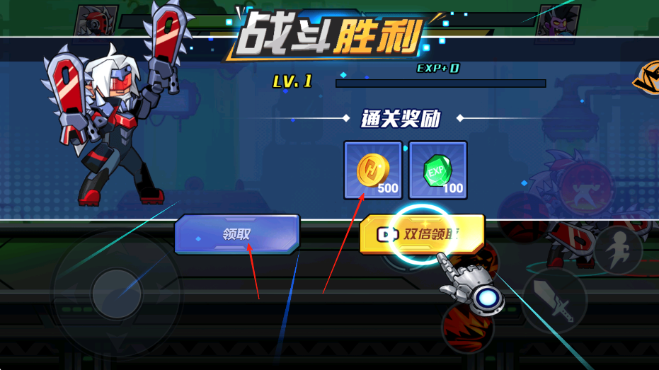 3、战斗胜利后,进入奖励领取界面,可选择领取获取金币、宝石等通关奖励,也能点击双倍领取,获得双倍奖励,助力角色成长。