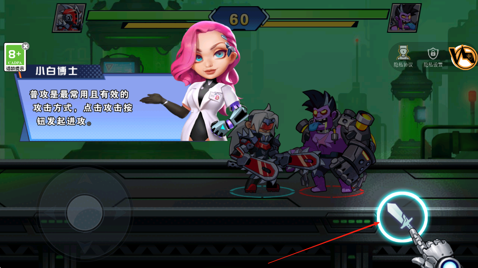1、进入战斗之后,根据提示,普攻是常用有效攻击方式,点击右侧攻击按钮,可对敌人发起普攻,持续输出伤害。