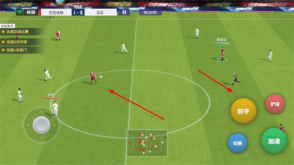 1、在比赛中操控球员带球推进,通过左侧虚拟摇杆调整方向,寻找进攻机会。