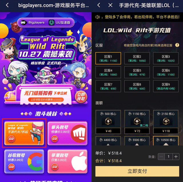 进入“Bigplayers游戏服务平台”界面后,点击峡谷激斗下方的手游代充按钮,就会进入手游充值界面,选择对应区服和想要充值的面额,点击下方的“立即支付”并完成必要的手续后,代充平台就会直接将选定的面额冲入指定账号了。