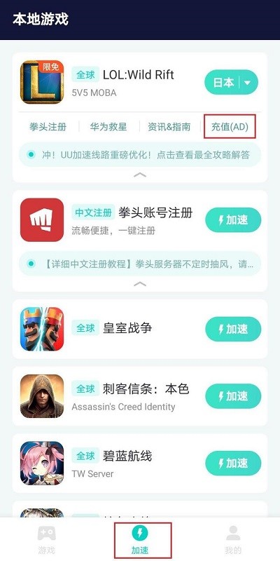 进入uu加速器后,首先点击底部的加速标签,跳转到游戏列表后,点击《LOL:Wild Rift》下方的“充值”按钮,就会跳转到UU合作的代充平台Bigplayers。