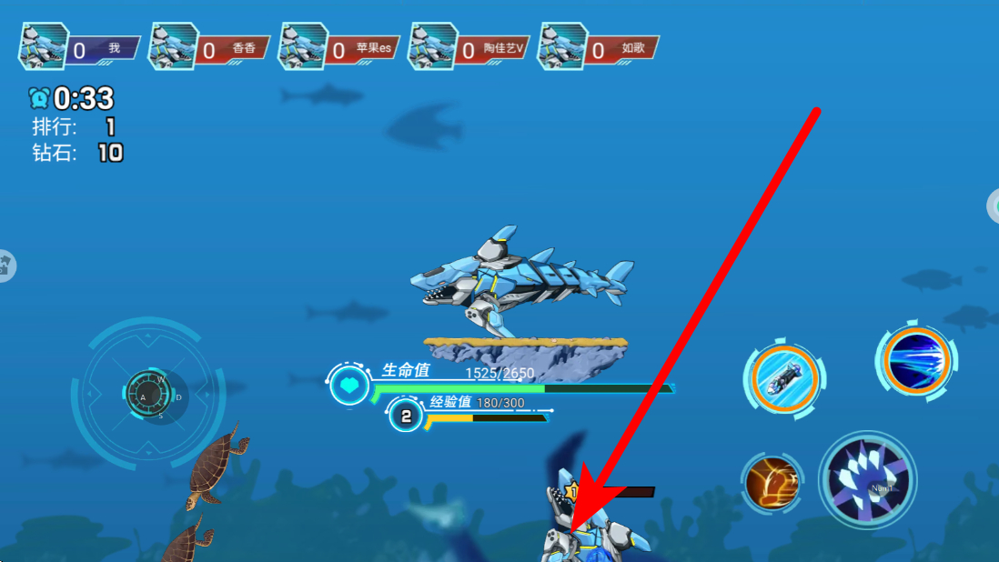 1、进入应用后,在战斗界面,通过左侧操作区域操控机甲鲨鱼移动,灵活调整位置,以更好应对战场情况,寻找合适的战斗时机。