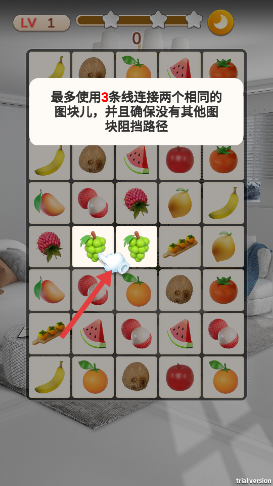 1、进入游戏后选择关卡,屏幕将呈现满屏图案,点击一个图案后,找到相同且连线不超过三条直线的图案,点击即可消除并获取少量金币。