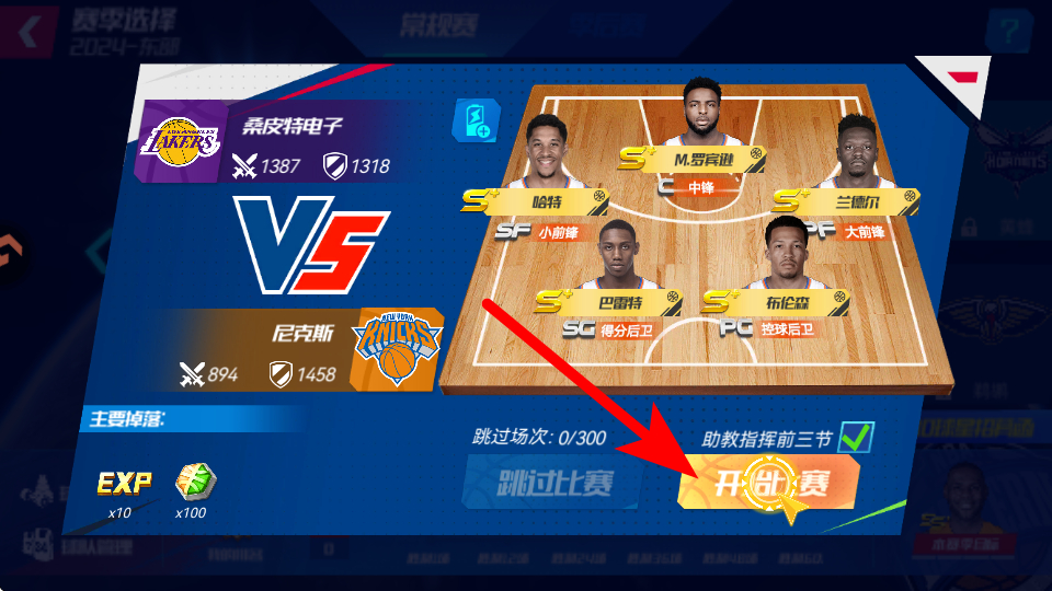 4、在比赛对战界面,可观察球员在球场上的实时表现,通过操作球员传球、投篮、防守等,参与比赛并争取胜利,同时可获得经验、道具等奖励。