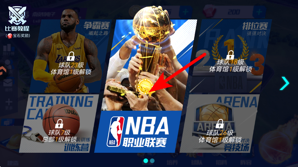 2、在比赛选择界面,选择可参与的赛事如NBA职业联赛,点击进入赛事准备界面。