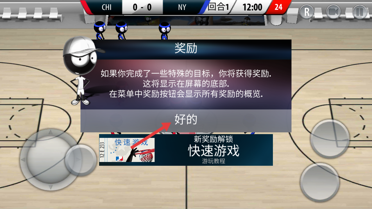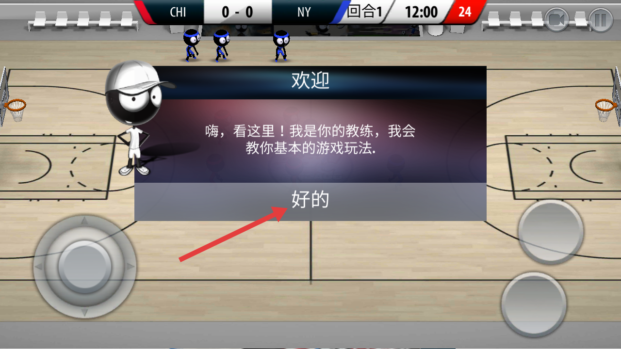 1、进入游戏后,先跟随教程熟悉操作界面,学习虚拟摇杆控制球员移动,点击投篮键练习近距离投篮,掌握基础动作要领。