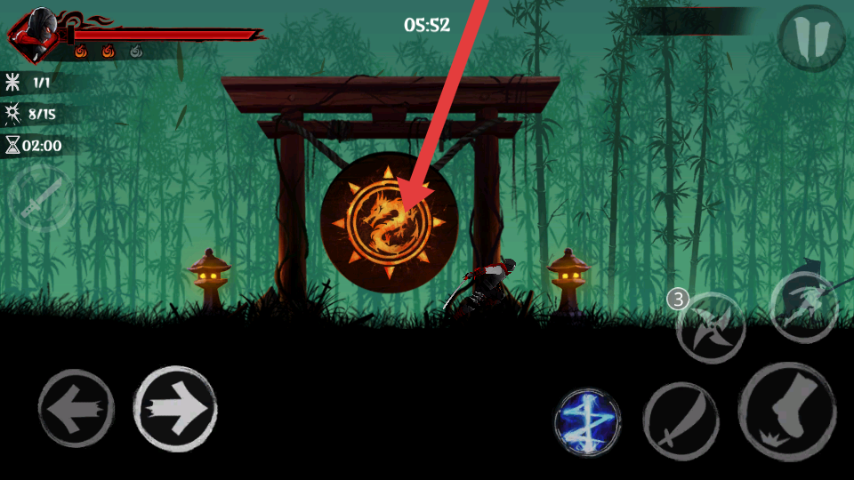 1、进入竹林场景后,利用左侧方向键灵活移动角色,躲避敌人从不同方向发起的攻击,可快速向左右移动,避开其下落攻击范围。