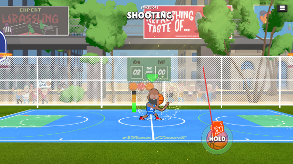 3、接近篮筐合适位置时,按住屏幕出现的HOLD投篮按钮,根据力度条控制投篮力度和角度,完成投篮动作。