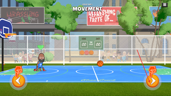 1、来到球场,通过点击屏幕左下角的方向按钮控制角色移动,靠近篮球获取球权。
