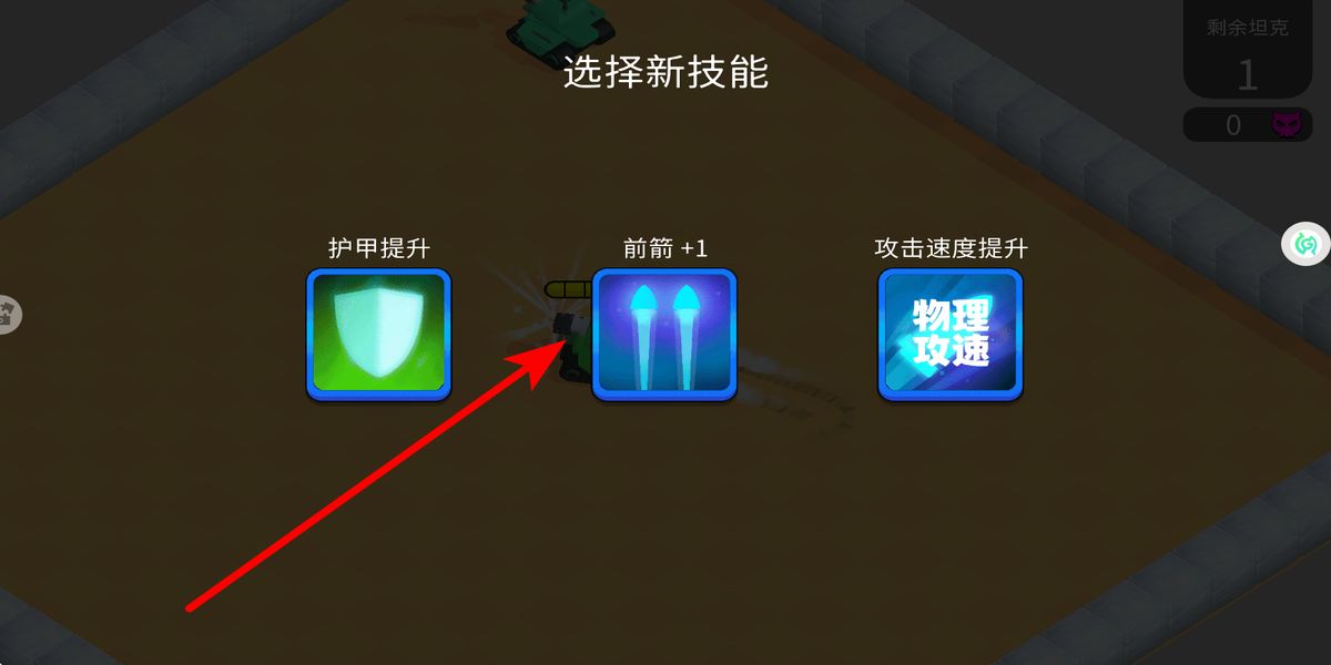 2、战斗中触发技能选择界面,依据战局需求挑选,若追求输出选前箭+1,若需生存选护甲提升,若要攻速选攻击速度提升,强化坦克作战能力。
