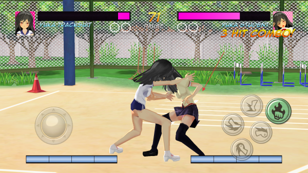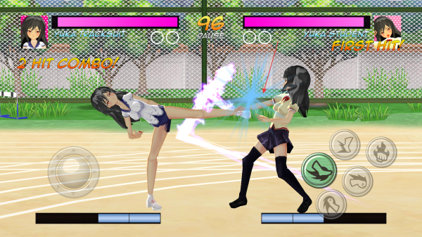 1、格斗对战操作:玩家通过按键控制高中女生角色,利用基础攻击键发起连续打击,当能量积累够时,按下技能键释放专属技能,在规定时间内将对手血量降至零即可获胜。