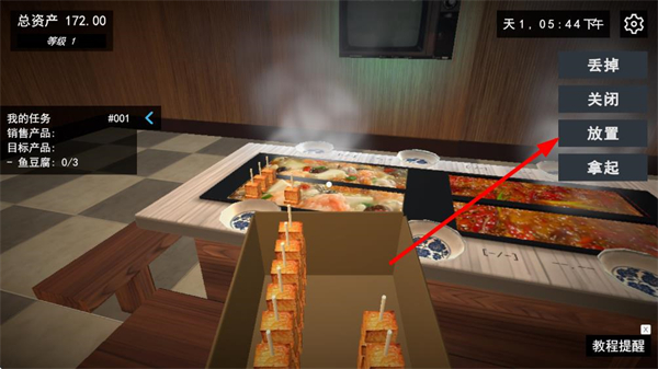 4、点击放置,将鱼豆腐等食材摆放到关东煮餐桌上,摆放时需注意餐桌空间,合理布局。