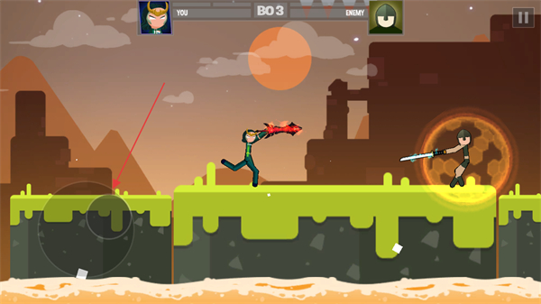 1、在场景中操控蜘蛛火柴人移动,利用武器与敌方火柴人战斗,注意走位躲避攻击。