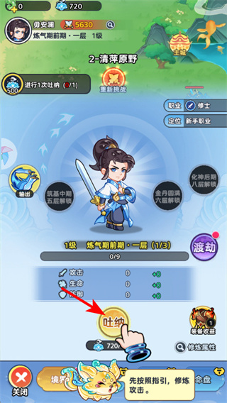 3、在角色界面中,点击吐纳按钮可获取修为,修为用于提升角色等级,是强化角色战力重要步骤。
