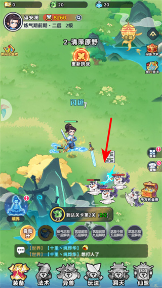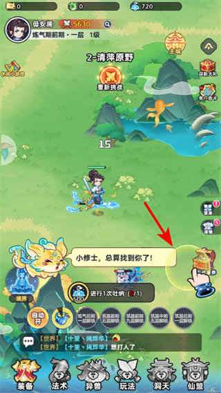 2、按照箭头指引点击游历按钮,可触发自动战斗推进关卡,这是快速通关、积累经验的核心方式。