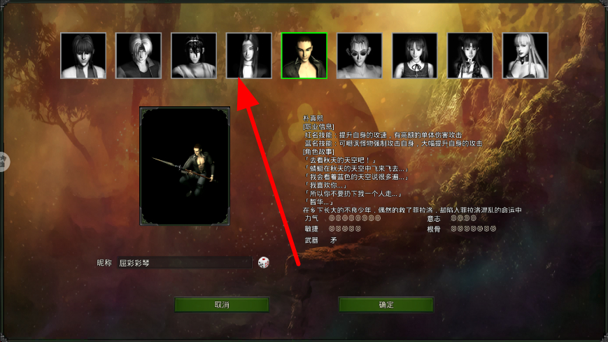 1、开始游戏后,角色创建有多个角色可供挑选创建,不同角色有着不同的技能与故事背景,选好心仪角色并设置好昵称后,点击确定。