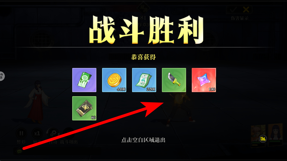 4、成功击败敌人后,会显示战斗胜利界面,同时可获得多种奖励,如不同数量的货币、道具等,点击空白区域可退出该界面,继续后续游戏内容。