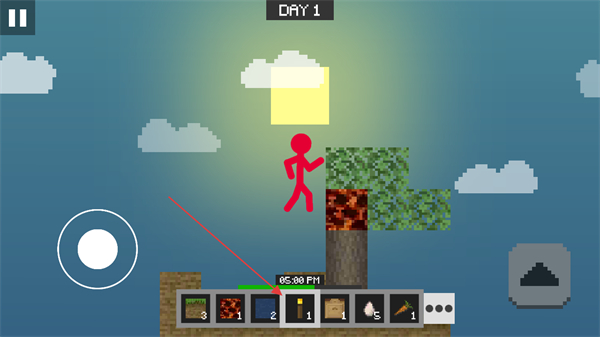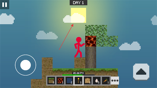 1、操控左侧虚拟摇杆移动火柴人,在空岛中探索树木等资源点。
